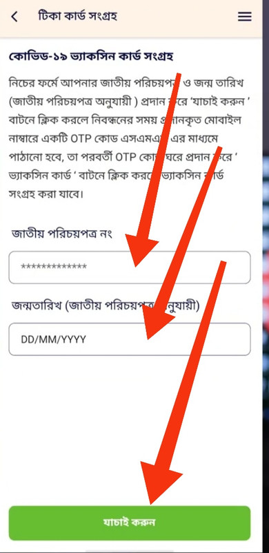 তারপর আবার জাতীয় পরিচয়পত্র নাম্বার ও জন্ম তারিখ দিয়ে যাচাই অপশন এ ক্লিক করূন