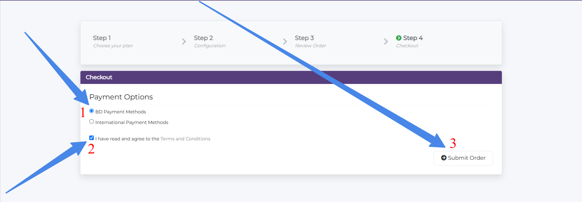Step6- “BD Payment Methods” সিলেক্ট করে “Terms & Conditions” বক্সে টিক্ দিতে হবে। তারপর “Submit Order”-এ ক্লিক করতে হবে।