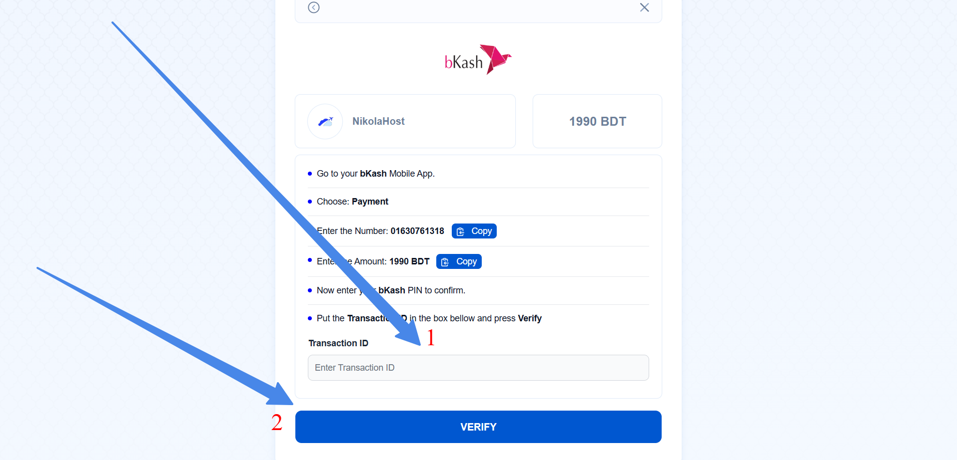 Step8- তারপর “Transaction ID” টা বসিয়ে “Verify” এ ক্লিক করলেই আপনার হোস্টিং একটিভ হয়ে যাবে।