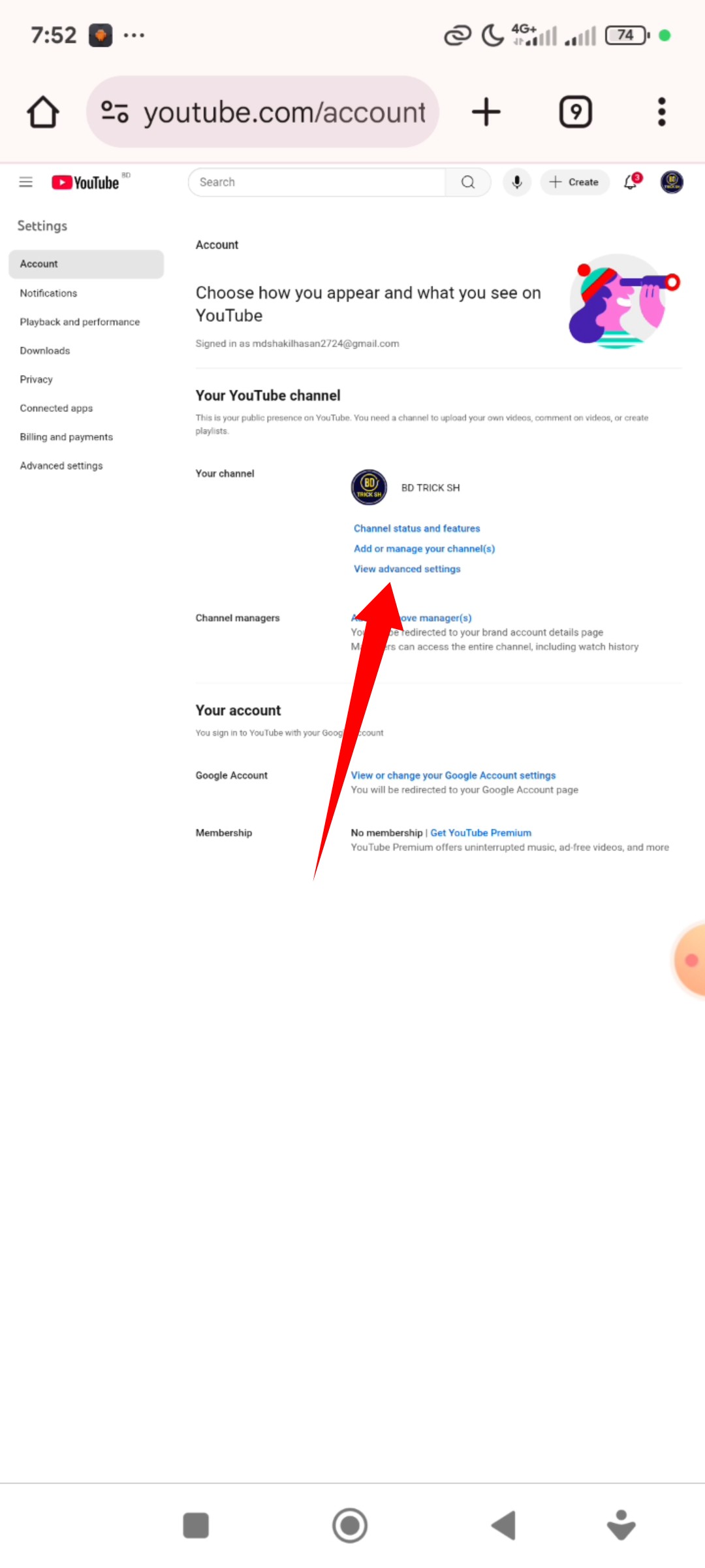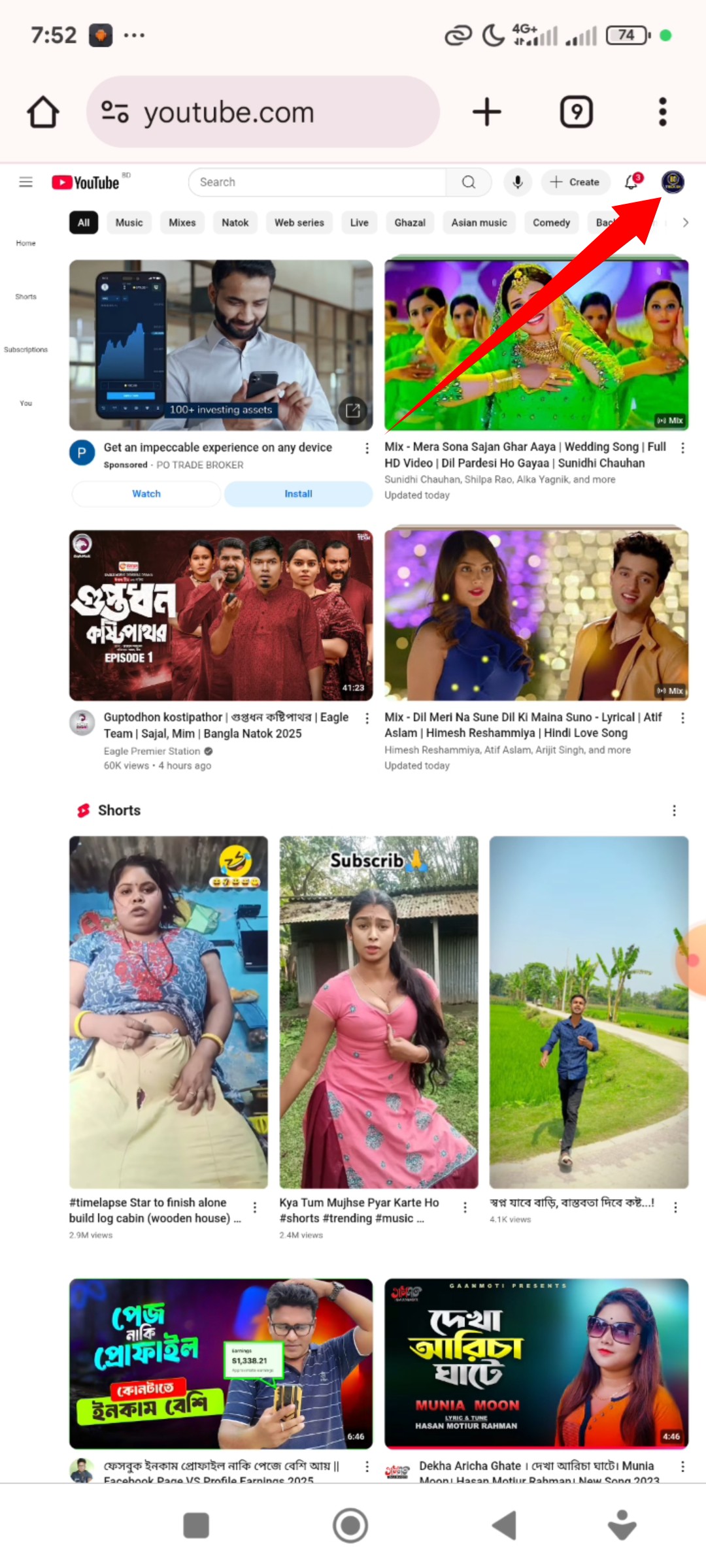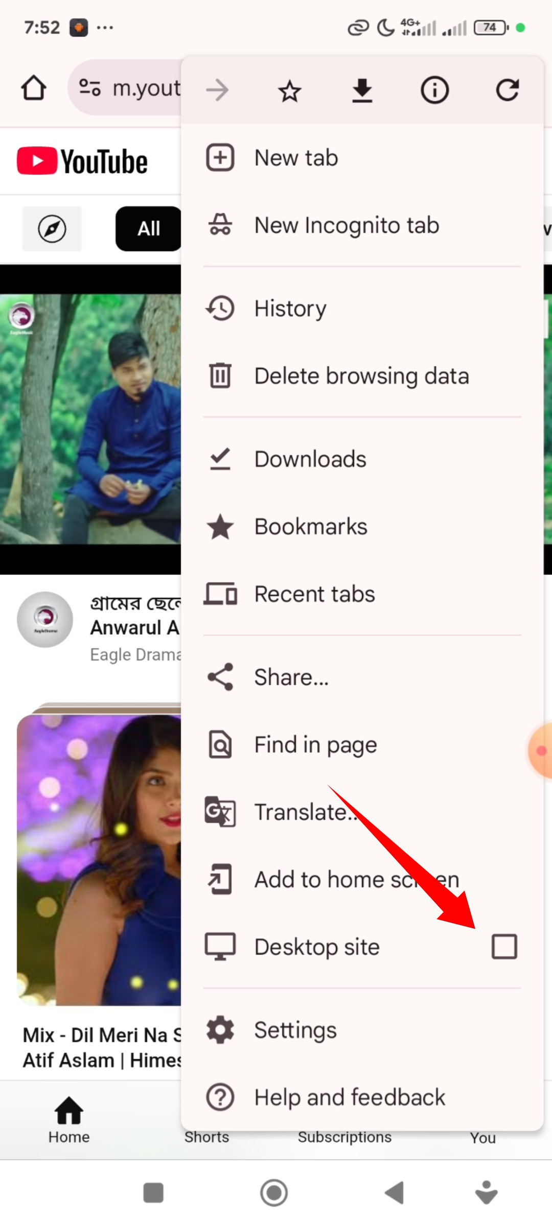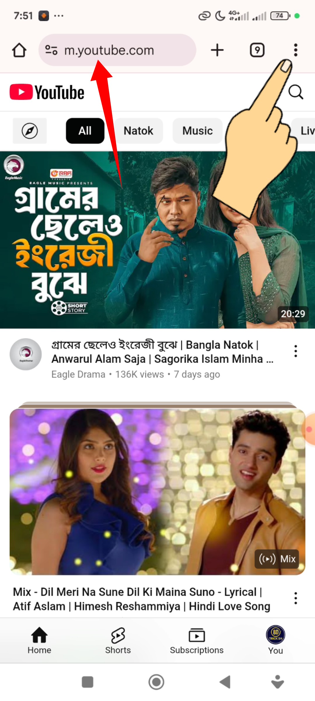 প্রথমে আপনার ফোনের Chrome ব্রাউজারে এসে Youtube.com লিখে সার্চ করে আপনার ইউটিউব চ্যানেলটি লগইন করেনিন এবং ওপরে ৩ ডটে ক্লিক করুন।