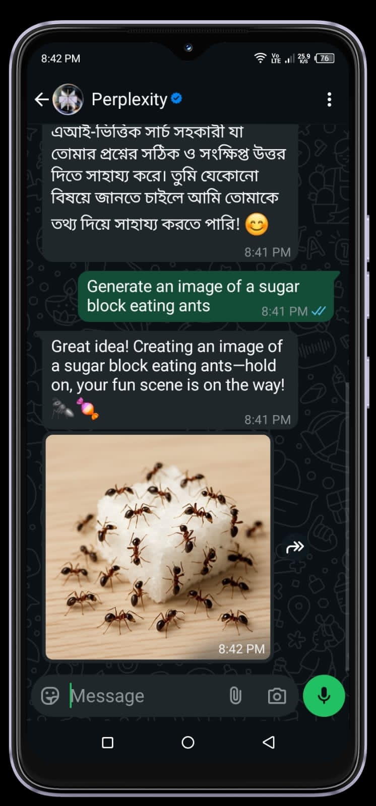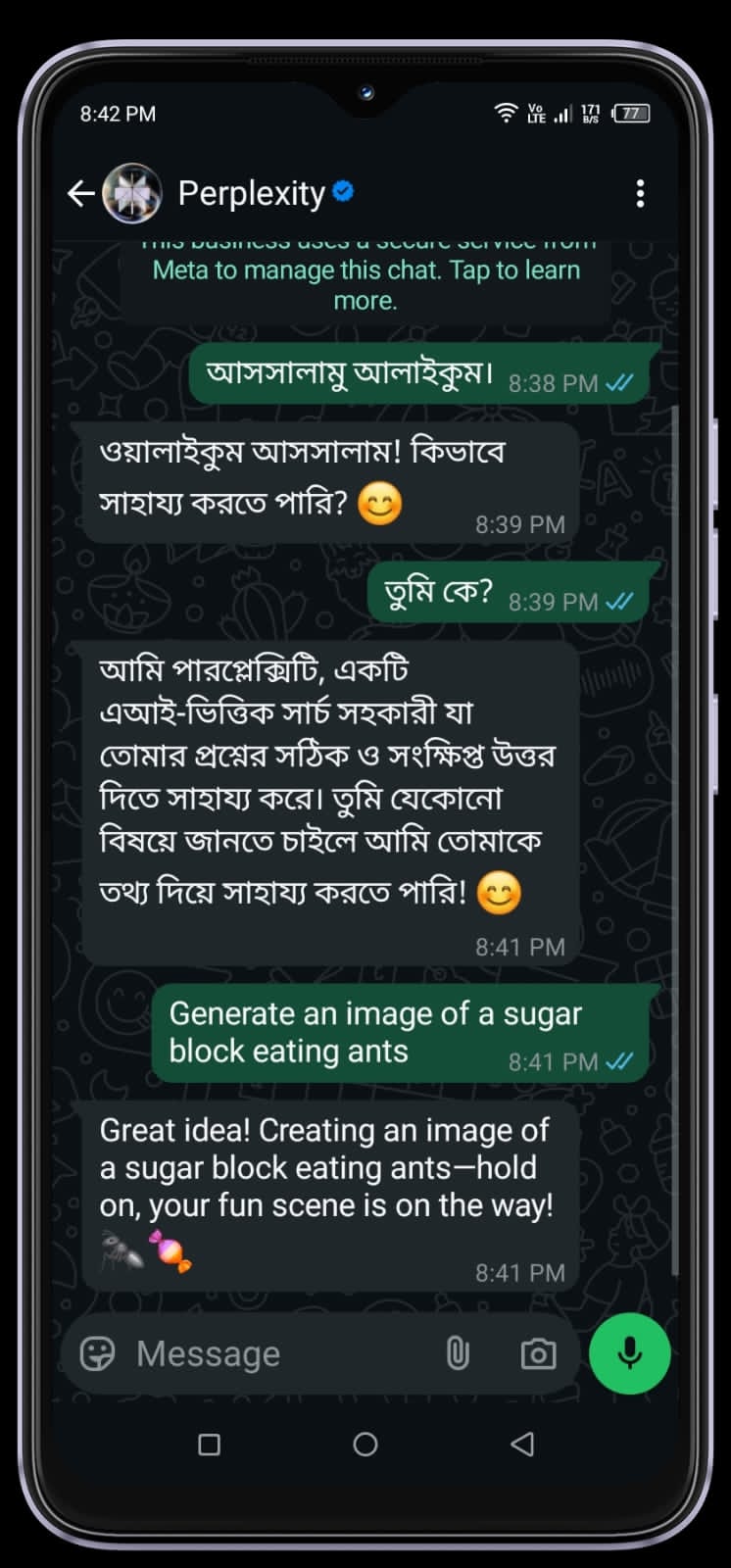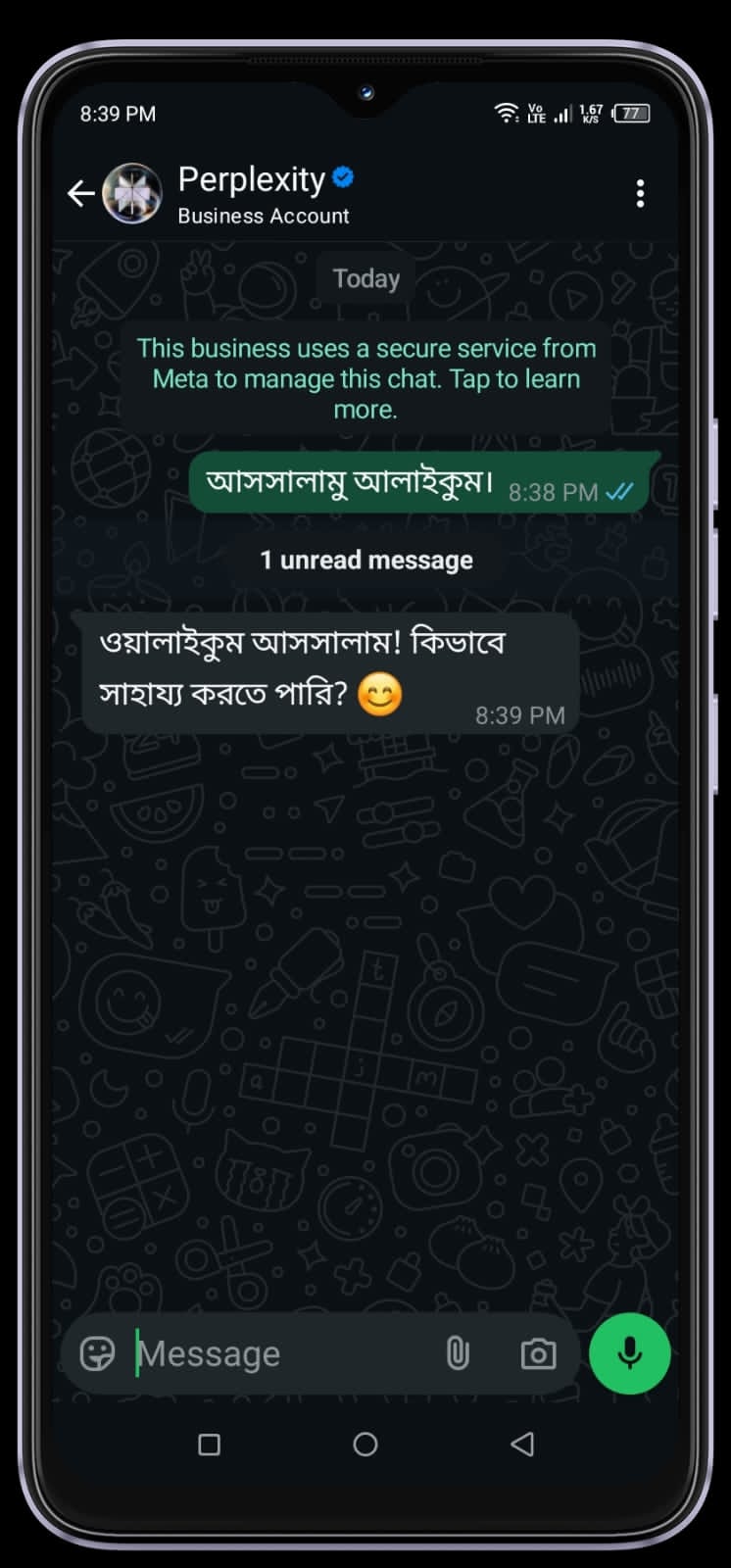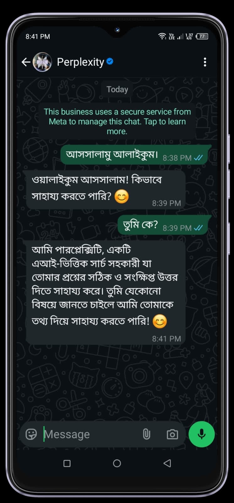 এরপর Whatsapp আমাদেরকে কিছু মেসেজ সাজেস্ট করবে। সেগুলোকে তোয়াক্কা না করে আমি প্রথমে সালাম দিলাম। আর Perplexity সালামের জবাব দিলো।