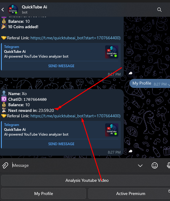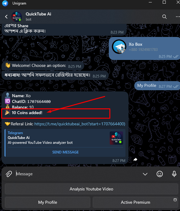 এখন আপনি এই বটে প্রতি ২৪ ঘন্টা পর পর ১০ কয়েন করে বোনাস নিতে পারবেন। এটা ছাড়াও রেফার করে আনলীমিটেড বোনাস নিতে পারবেন। আর যারা এসব ঝামেলা করতে চান না তারা Acative Premium অপশনে ক্লিক করে টাকা দিয়ে কিনতে পারবেন, বাংলাদেশি বিকাশ নগদ সাপোর্ট করে।