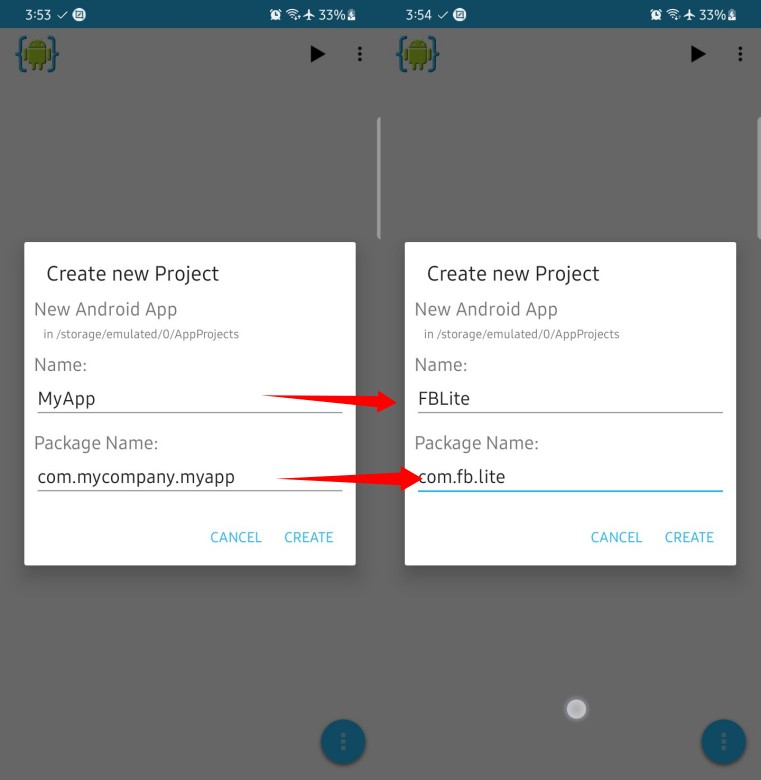 4. Name: ❝FBLite❞ এবং Package Name: ❝com.fb.lite❞ দিয়ে CREATE এ ক্লিক করুন।