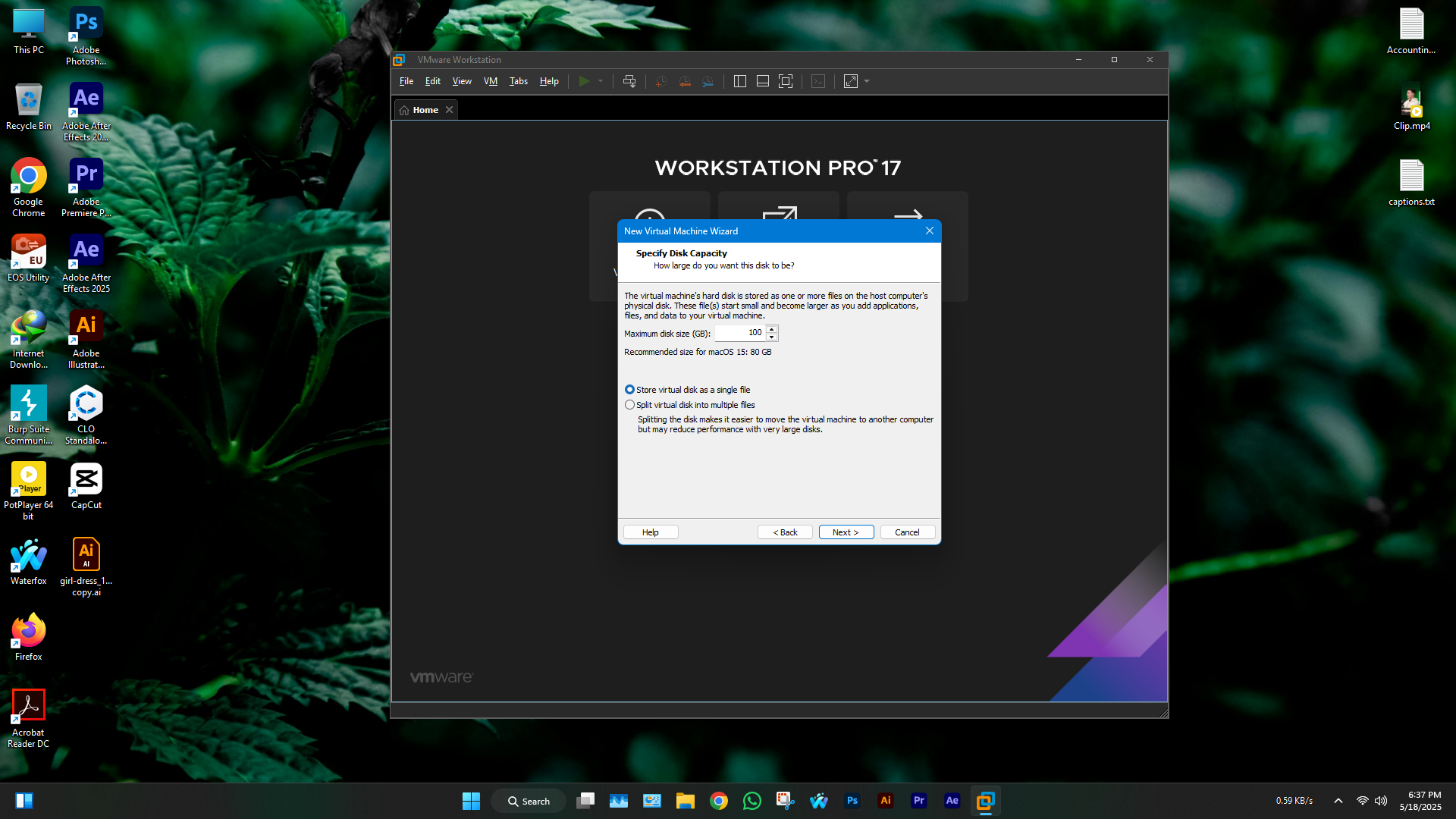 ডিস্ক সাইজ ১০০ জিবি এর মত দিয়ে Store virtual disk as a single file সিলেক্ট করে নেক্সট করুন । ডিস্ক সাইজ সর্বনিম্ন ৮০ জিবি রাখবেন ।