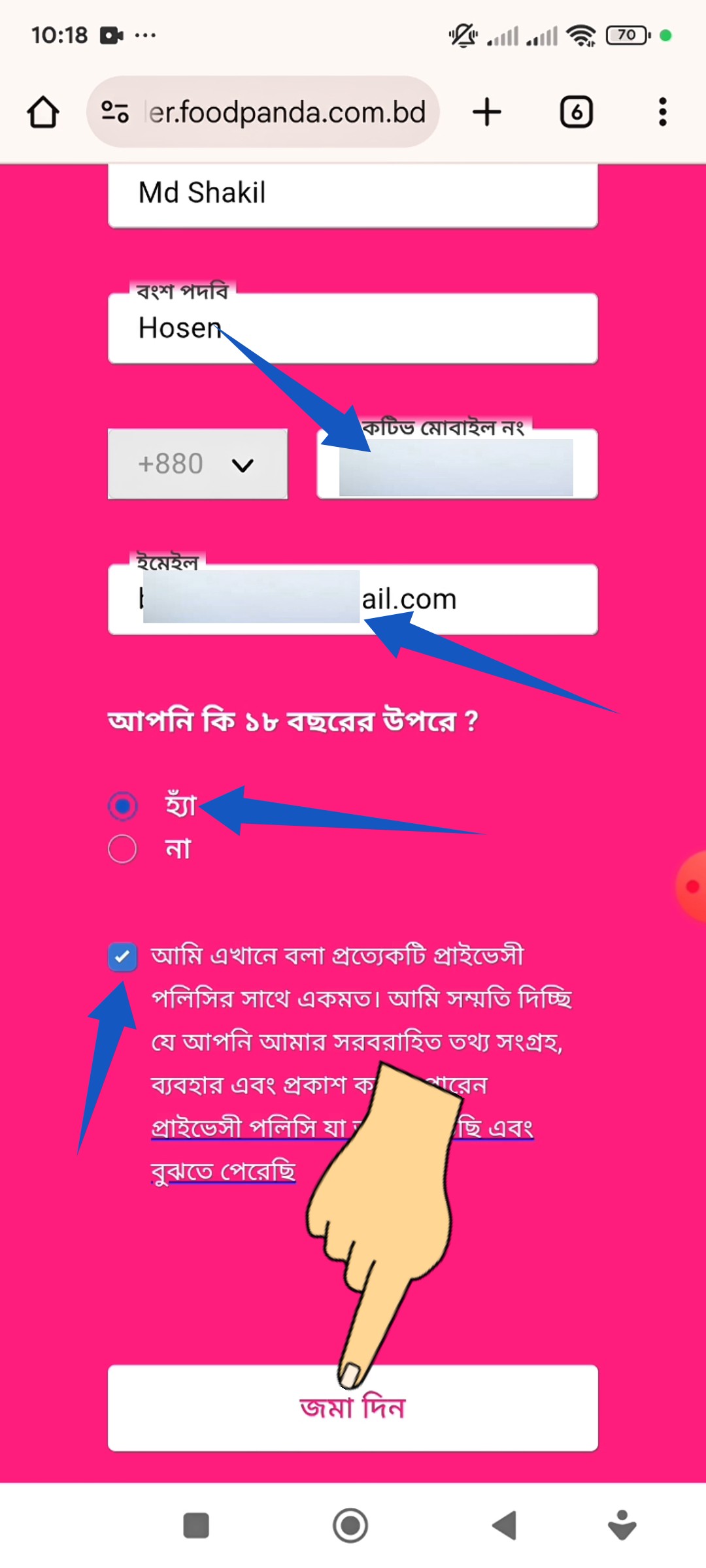 এরপর মোবাইল নাম্বার ও জিমেইল দিবেন। এখানে হ্যা দিয়ে,টিকমার্ক করে জমাদিন ক্লিক।
