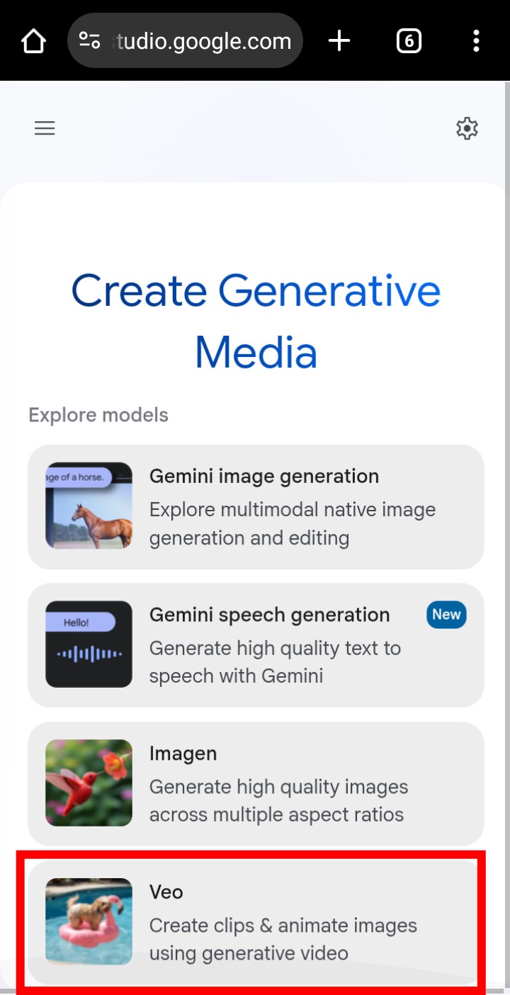 -এবার three dot মেনু থেকে Create Generative Media select করতে হবে এবং নিচে Veo তে ক্লিক করতে হবে