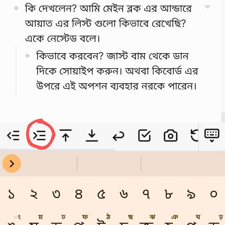 লগসেক যেহেতু একটি আউটলাইনার বেসড নোট অ্যাপ সেহেতু নেস্টেড ব্লক এর মজাটা সঠিক ভাবে তুলুন। যেমন আমি কুরআন রিড করার জন্য লিস্ট তৈরি করেছি এবং নেস্টেড করেছি নিচে দেখুন।